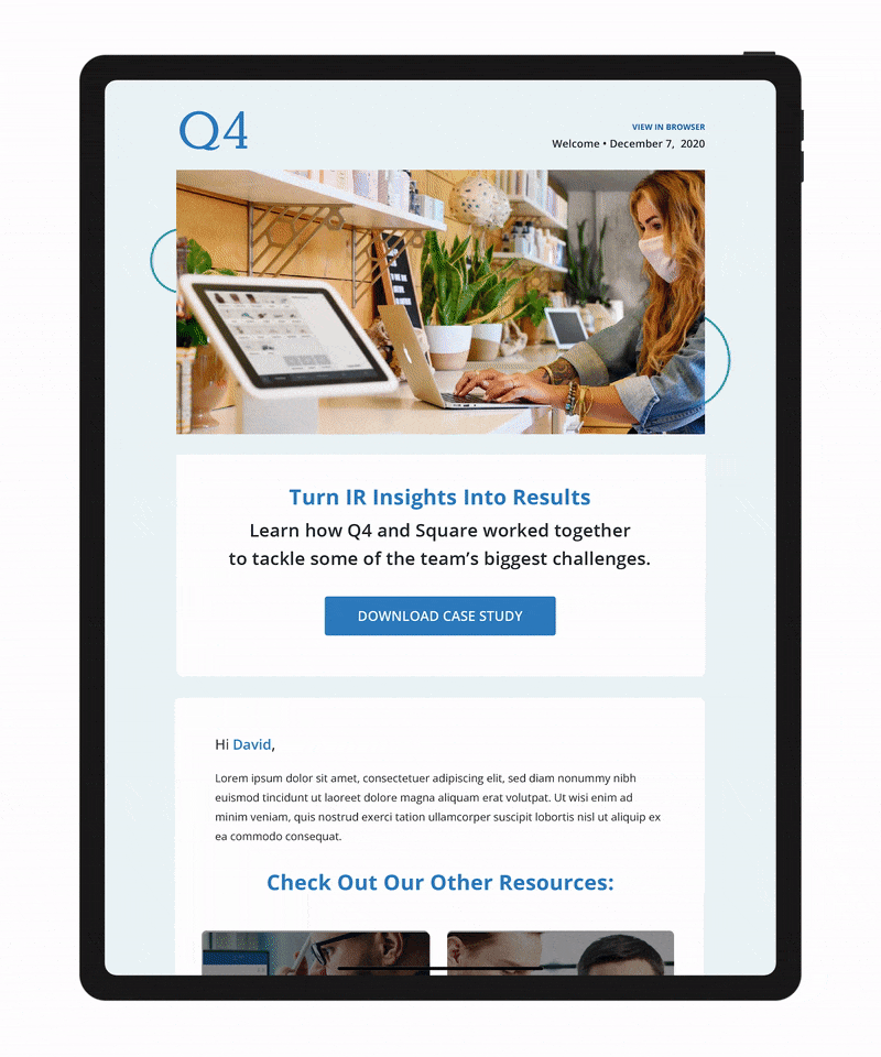 Below are two videos, a Sizzle Reel and a Teaser that I produced for Q4. Both of the videos below were created completely in-house without the use of an outside agency. Each video required extensive planning with several stakeholders, creating storyboards, sourcing music, stock footage, editing video and motion graphics. Using Asana throughout the process was crucial in making sure to meet key checkpoints and deadlines. Each video took me between 2-3 weeks to create from first pitch to final product. Miro was used to create storyboards, and videos were edited in Premiere Pro and After Effects.