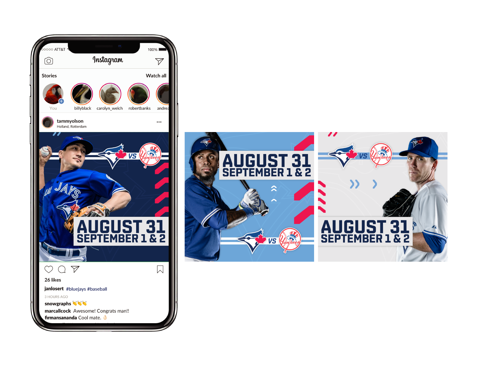 I created several ads for the Toronto Blue Jays to be used on social media, web and print. The Toronto Blue Jays are a Canadian professional baseball team based in Toronto. They wanted to create new assets for an upcoming matchup between the Toronto Blue Jays and the New York Yankees. Since these ads are meant to be seen together to promote the event, they needed to show a cohesive story.
