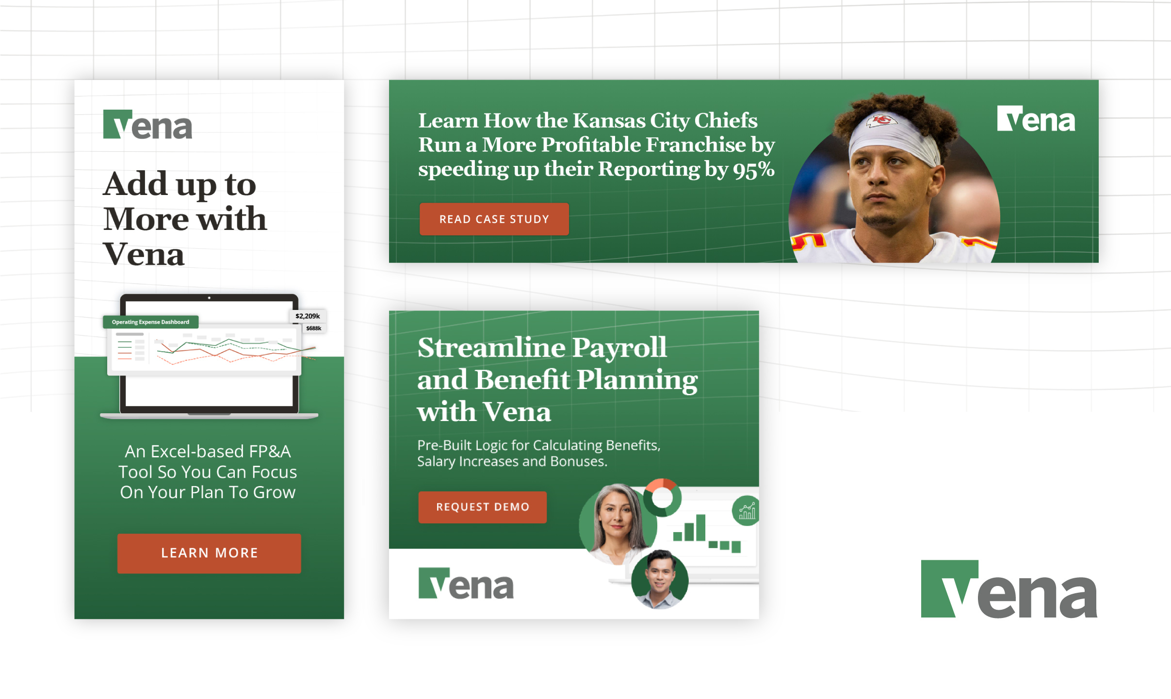 I worked with Vena Solutions to develop display ads in different sizes, to be used in various stages of the sales funnel. Vena is a Canadian intuitive budgeting, planning and revenue forecasting software for medium to large sized organizations.